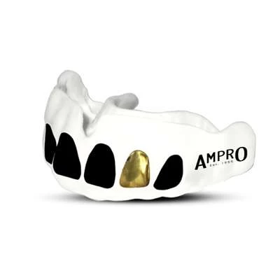 Ampro Custom Dentist Performance White Mouth Guard – Gold Tooth. White Professional Mouth Guard, with a white coloured inner, and the black teeth with one gold toof design to the front and small Ampro logo on side. Scientifically tested and Bespoke made at 5mm for ultimate comfort and maximum protection, these professional gumshields are the ultimate for protection in contact sports. Custom Fit and completely hand made by dentists, they are finished to fit your teeth and gums exact, making your Ampro dental mouth guard not only comfortable, but it will not make you gag. Made in England.