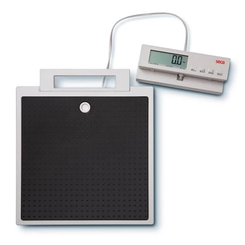 The seca 869 scale comes with a 2m cable connects the display with the weighing base. The advantage to this is the display can be set up separately from the base and read from its position on the wall or desk. This scale also has many extra weighing functions: BMI for nutritional conditions and HOLD to keep measurements displayed. It is also ideal for stationary or mobile use thanks to the handle, compact size, low weight and a leveling base for set-up on all types of surfaces.